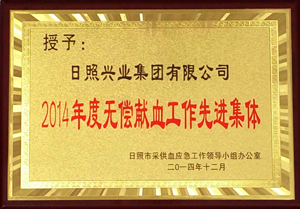 ·2014年12月,授予興業(yè)集團(tuán)2014年底無(wú)償獻(xiàn)血工作先進(jìn)集團(tuán)稱號(hào)