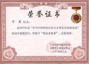 · 2004年2月,授予丁杰董事長(zhǎng)“爭(zhēng)當(dāng)中國(guó)特色社會(huì)主義事業(yè)優(yōu)秀建設(shè)者”