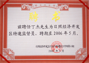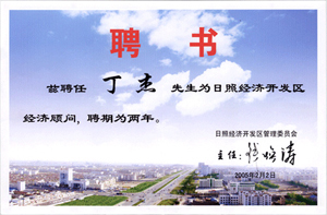 · 2003年7月,茲聘任丁杰董事長(zhǎng)為日照市東港區(qū)人民政府高級(jí)經(jīng)濟(jì)顧問