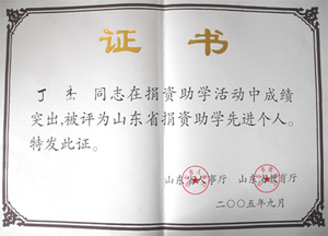 · 2005年9月,丁杰董事長(zhǎng)榮獲“山東省捐資助學(xué)先進(jìn)個(gè)人”榮譽(yù)稱號(hào)