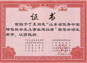 · 2007年12月,丁杰董事長(zhǎng)榮獲“山東省優(yōu)秀中國(guó)特色社會(huì)主義事業(yè)建設(shè)者”榮譽(yù)稱號(hào)