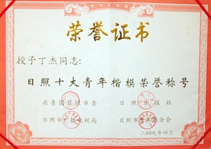 · 2009年4月,丁杰董事長(zhǎng)榮獲“日照楷模十大青年”榮譽(yù)稱號(hào)