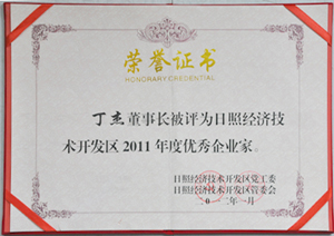 ·2012年1月,丁杰董事長(zhǎng)被評(píng)為“日照市經(jīng)濟(jì)技術(shù)開發(fā)區(qū)優(yōu)秀企業(yè)家”榮譽(yù)稱號(hào)