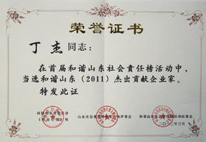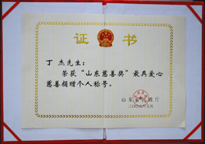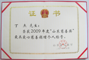· 2009年5月,丁杰董事長(zhǎng)榮獲“山東慈善獎(jiǎng)”最具愛心慈善捐贈(zèng)個(gè)人榮譽(yù)稱號(hào)