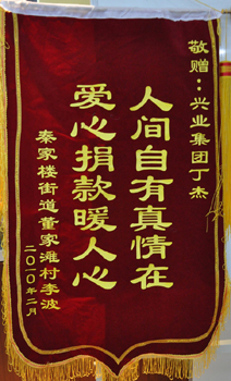 · 2010年2月,敬贈(zèng)興業(yè)集團(tuán)董事長(zhǎng)丁杰“人間自有真情在,愛心捐款暖人心”錦旗