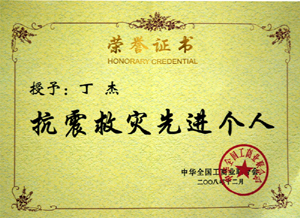 · 2008年12月,丁杰董事長(zhǎng)榮獲“抗震救災(zāi)先進(jìn)個(gè)人”榮譽(yù)稱號(hào)
