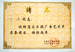 · 2007年11月,誠(chéng)聘丁杰董事長(zhǎng)為“日照廣電藝術(shù)團(tuán)名譽(yù)團(tuán)長(zhǎng)”