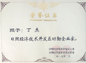 ·2017年2月,日照經(jīng)濟(jì)技術(shù)開發(fā)區(qū)授予丁杰董事長(zhǎng)“日照經(jīng)濟(jì)技術(shù)開發(fā)區(qū)功勛企業(yè)家”稱號(hào)。